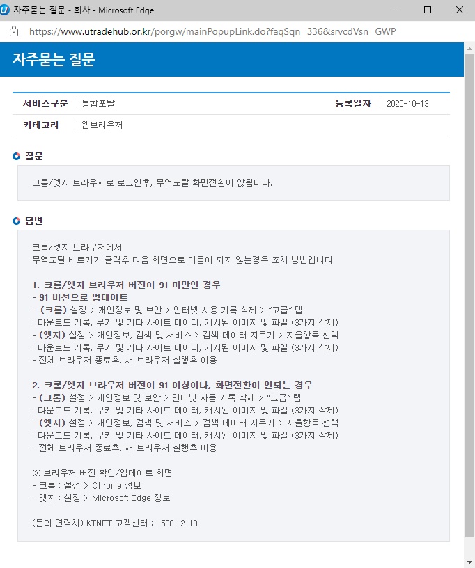 | A. 크롬/엣지 브라우저에서 무역포탈 바로가기 클릭후 다음 화면으로 이동이 되지 않는경우 조치 방법입니다. 1. 크롬/엣지 브라우저 버전이 91 미만인 경우 - 91 버전으로 업데이트 - (크롬) 설정 > 개인정보 및 보안 > 인터넷 사용 기록 삭제 > “고급” 탭 : 다운로드 기록, 쿠키 및 기타 사이트 데이터, 캐시된 이미지 및 파일 (3가지 삭제) - (엣지) 설정 > 개인정보, 검색 및 서비스 > 검색 데이터 지우기 > 지울항목 선택 : 다운로드 기록, 쿠키 및 기타 사이트 데이터, 캐시된 이미지 및 파일 (3가지 삭제) - 전체 브라우저 종료후, 새 브라우저 실행후 이용 2. 크롬/엣지 브라우저 버전이 91 이상이나, 화면전환이 안되는 경우 - (크롬) 설정 > 개인정보 및 보안 > 인터넷 사용 기록 삭제 > “고급” 탭 : 다운로드 기록, 쿠키 및 기타 사이트 데이터, 캐시된 이미지 및 파일 (3가지 삭제) - (엣지) 설정 > 개인정보, 검색 및 서비스 > 검색 데이터 지우기 > 지울항목 선택 : 다운로드 기록, 쿠키 및 기타 사이트 데이터, 캐시된 이미지 및 파일 (3가지 삭제) - 전체 브라우저 종료후, 새 브라우저 실행후 이용 ※ 브라우저 버전 확인/업데이트 화면 - 크롬 : 설정 > Chrome 정보 - 엣지 : 설정 > Microsoft Edge 정보 (문의 연락처) KTNET 고객센터 : 1566- 2119 |