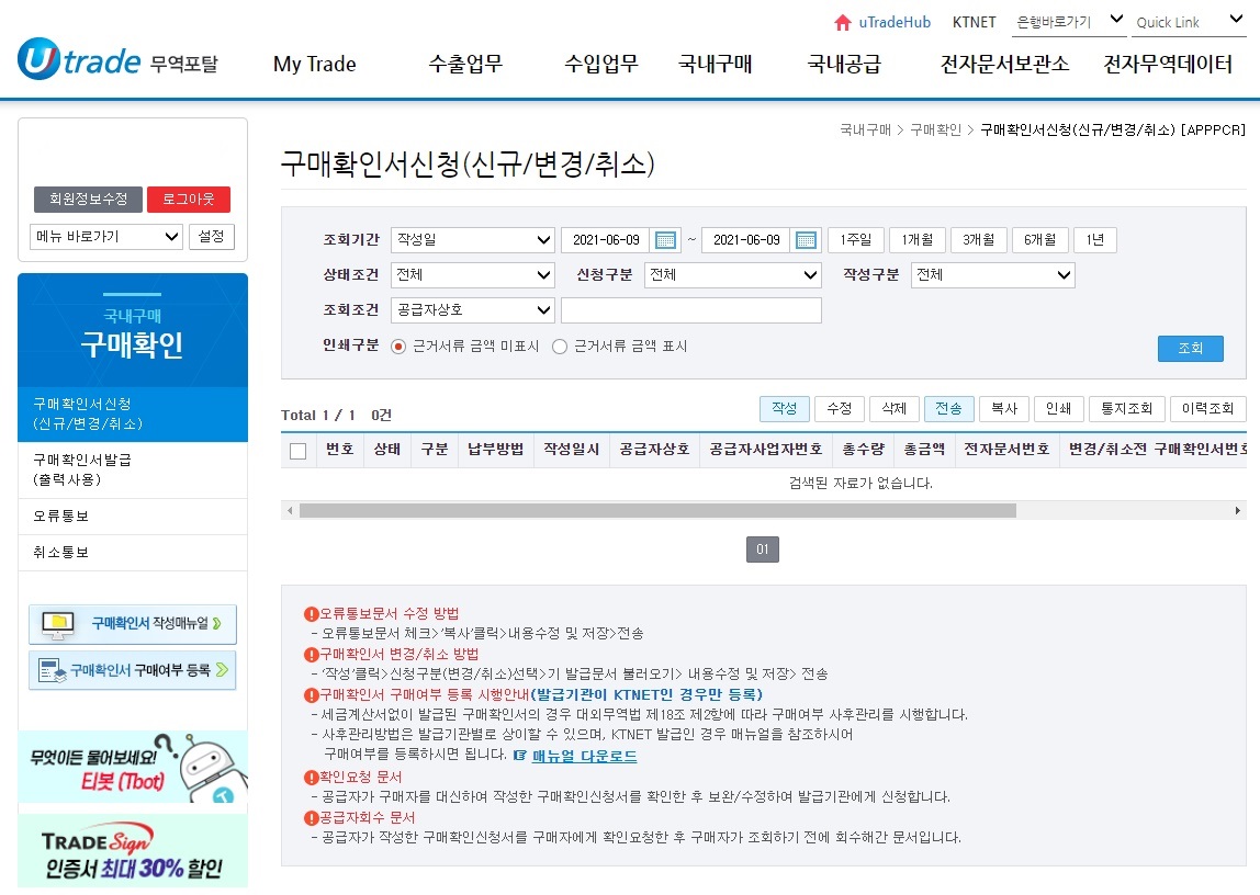 구매확인서 작성하려고 uTradeHub 로그인을 했는데 구매확인서 창으로 넘어가지를 않더라.