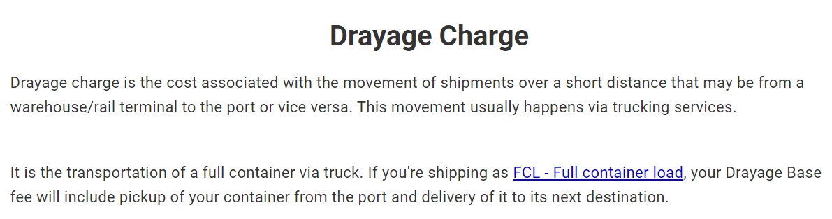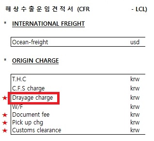 LCL 화물의 경우 도착지 항구에서 컨테이너를 양하한 후 컨테이너에 적재되있는 화물들을 해체하기 위해 지정된 CFS로 운반하게 된다. 이때 도착지 항구에서 CFS까지 컨테이너 운송비용을 컨테이너의 공간을 나눠쓰고 있는 여러 호주가 자신의 화물 크기(부피,무게)만큼 나누어 부담하게 되고 이를 Drayage Chage라고 한다. 그러므로 이 비용은 FCL화물의 경우에는 발생하지 않는다.