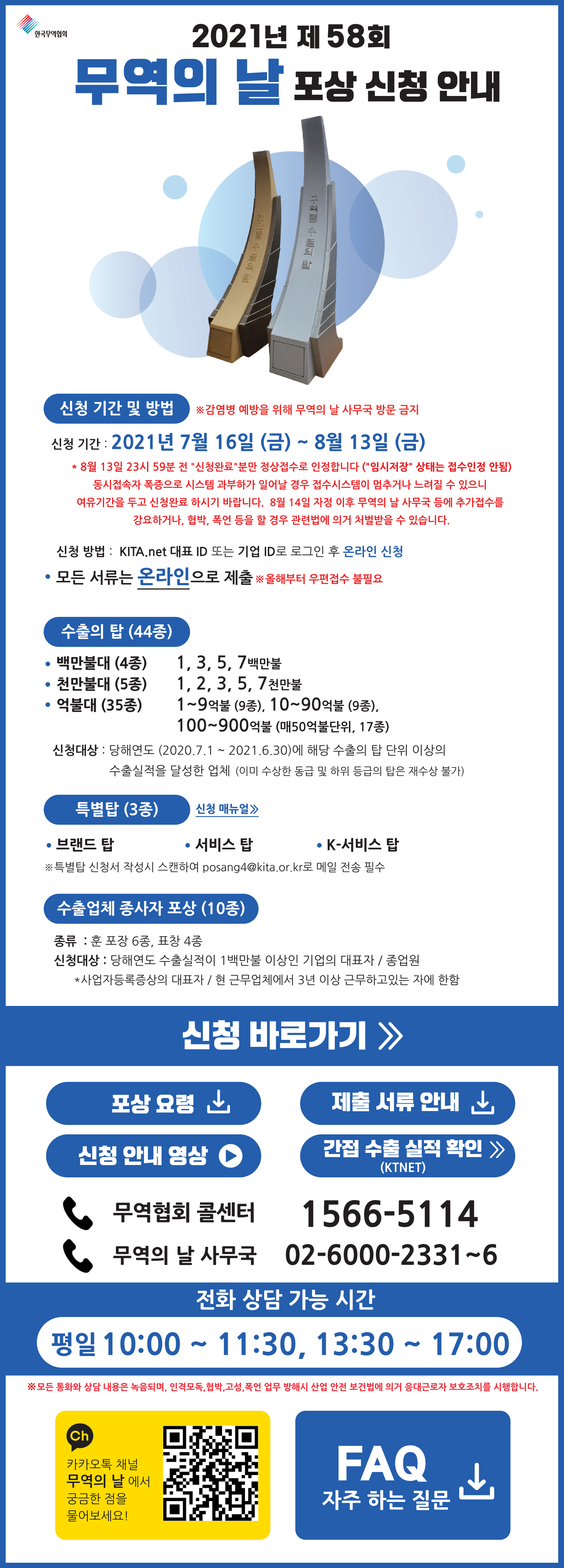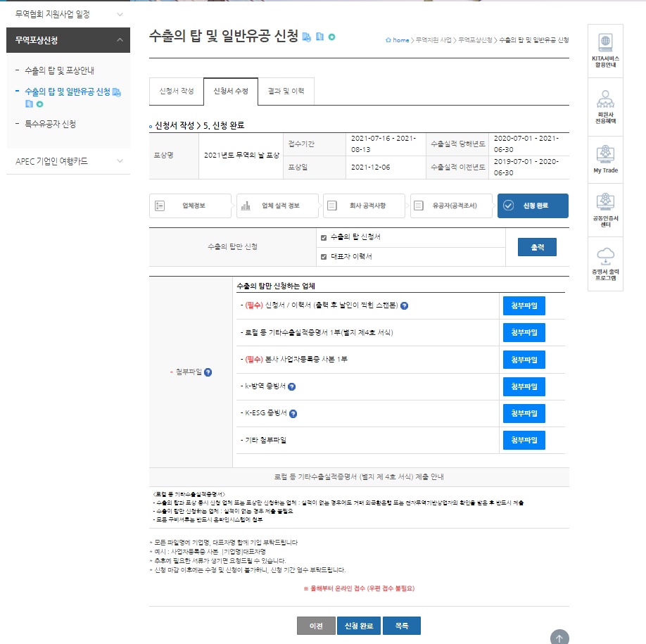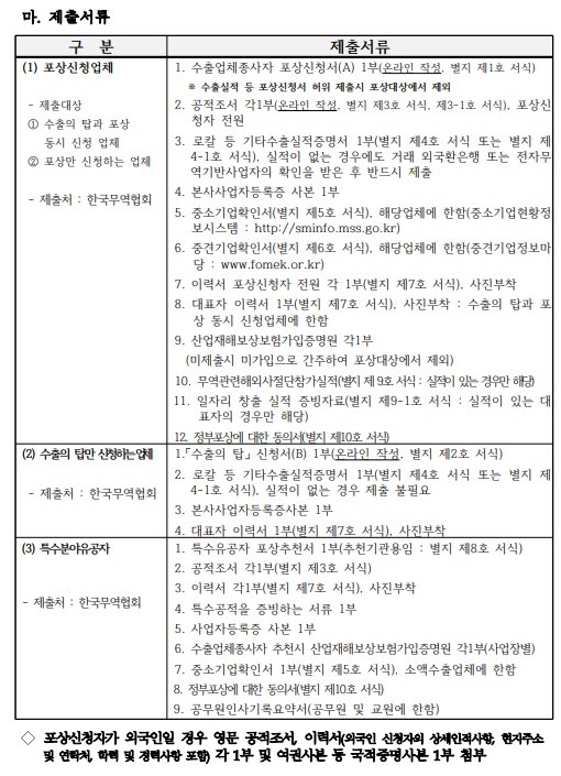 수출의 탑(44종)과 특별탑(3종), 수출업체 종사자 포상(10종) 이렇게 다양한 상이 있어서 나도 신청해봤다.