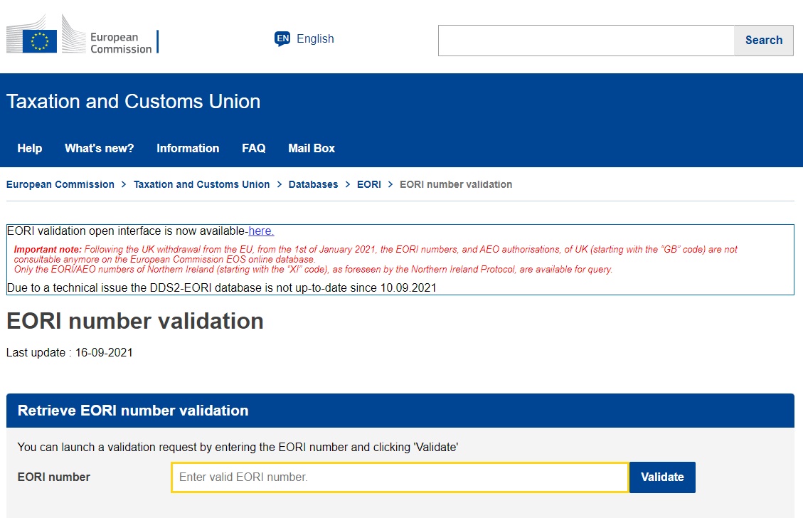 | Important note: Following the UK withdrawal from the EU, from the 1st of January 2021, the EORI numbers, and AEO authorisations, of UK (starting with the “GB” code) are not consultable anymore on the European Commission EOS online database. Only the EORI/AEO numbers of Northern Ireland (starting with the “XI” code), as foreseen by the Northern Ireland Protocol, are available for query. Due to a technical issue the DDS2-EORI database is not up-to-date since 10.09.2021 |