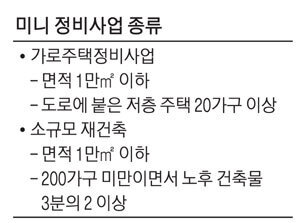 사업대상 지역은 면적 1만m2 이하이고, 노후 · 불량건축물 수가 전체 건축물의 2/3 이상이며, 기존주택이 모두 단독주택이면 10호 이상, 공동주택이면 20세대 이상(혼합인 경우 20채 이상)인 지역 또는 가로구역에 해당한다.