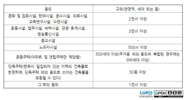 마. 공동주택(아파트 · 연립주택만 해당) : 300세대 이상 (주거 외 용도와 복합시 200세대 이상)