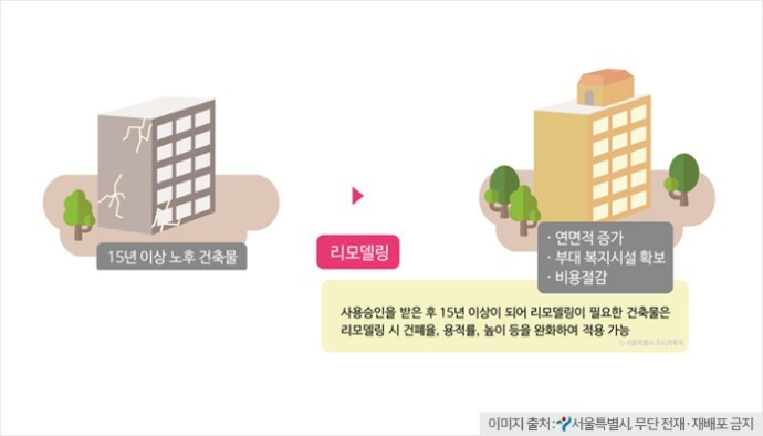 - 규제가 적은 리모델링 ? : 현재 규정 상 리모델링이 재건축보다는 추진하기가 쉬운 편이에요. 재건축 연수, 안전 진단, 기타 의무 사항들이 비교적 자유롭고, 주변 지역 영향분석이나 지역공유시설, 임대주택 등 구체적인 공공성 확보 방안도 없는 상황이다.