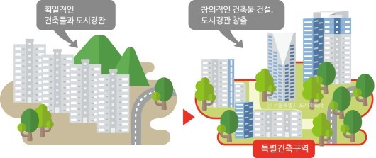 - 특별건축구역 지정*, 왜 하는거야? : 그간 재건축에 따른 집값 상승 이익의 큰 부분을 해당 토지 소유주들이 누렸어요. 하지만 특별건축구역 지정 시 임대주택 도입과 공원 등 커뮤니티시설 설립을 더 적극적으로 해서 재개발 이익을 다 함께 나누어 가질(공공화) 수 있죠. 특별건축구역은 건폐율, 건축물 높이, 일조권 등 건축규제를 배제, 완화하거나 통합 적용할 수 있도록 한 것이다. 자유로운 건축 설계가 반영된 창의성 높은 복합단지 조성이나 지역 랜드마크 건설이 촉진될 수 있게 하기 위함이다.