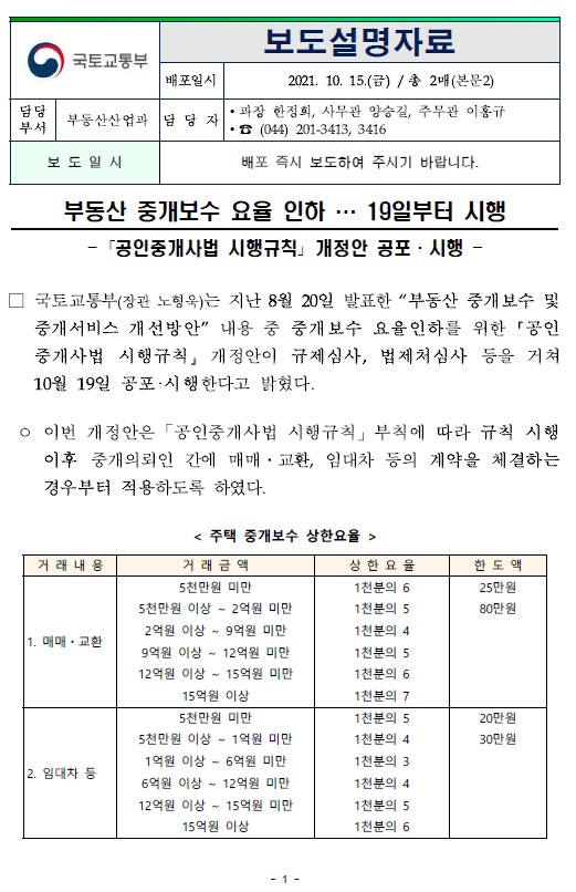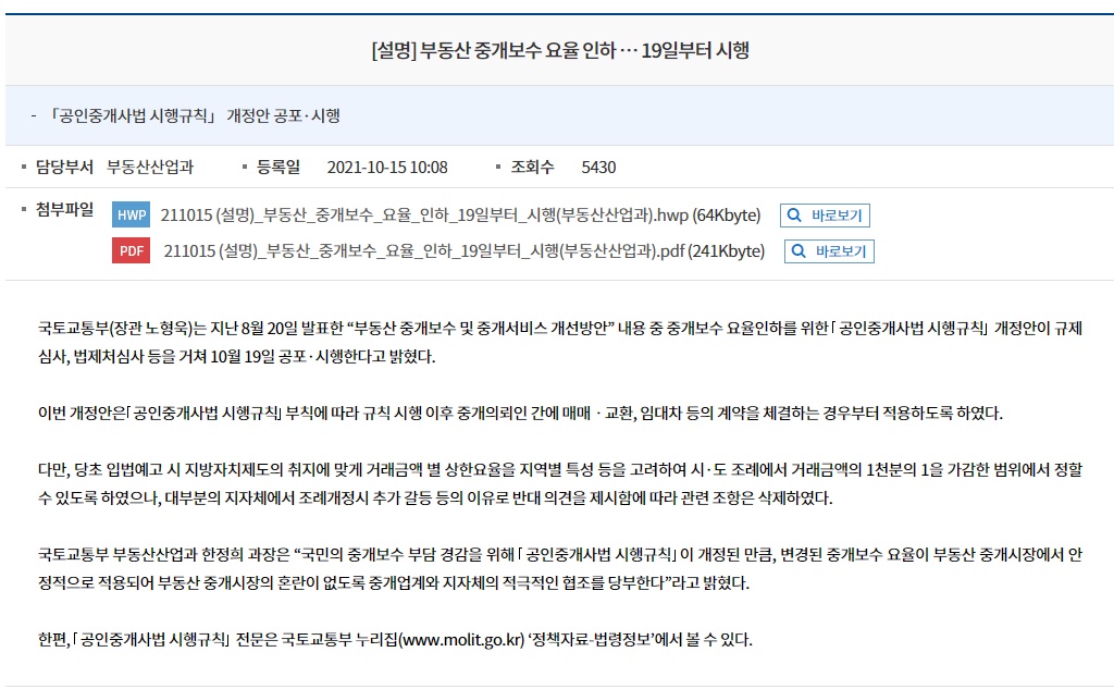 국토교통부는 중개보수 요율인하를 위한 공인중개사법 시행규칙 개정안이 규제심사와 법제처심사 등을 통과해 이달 19일 공포·시행된다고 15일 밝혔다.