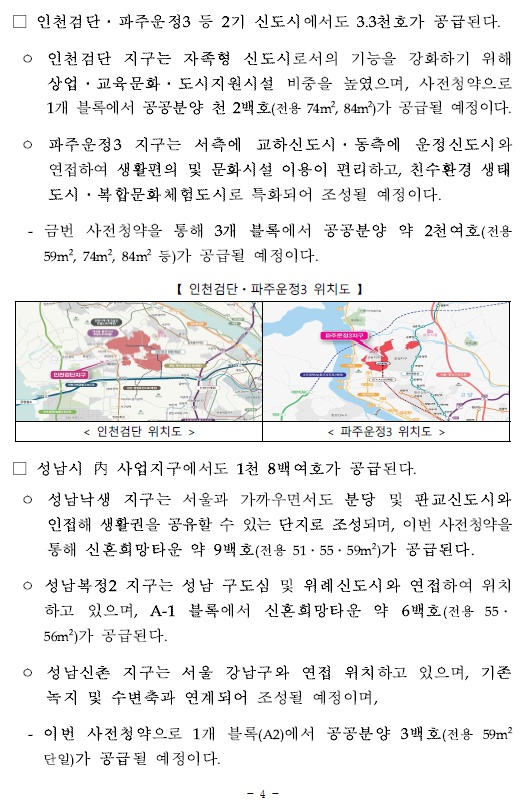성남낙생 지구는 서울과 가까우면서도 분당 및 판교신도시와 인접해 생활권을 공유할 수 있는 단지로 조성되며, 이번 사전청약을 통해 신혼희망타운 약 9백호(전용 51ㆍ55ㆍ59m²)가 공급된다.