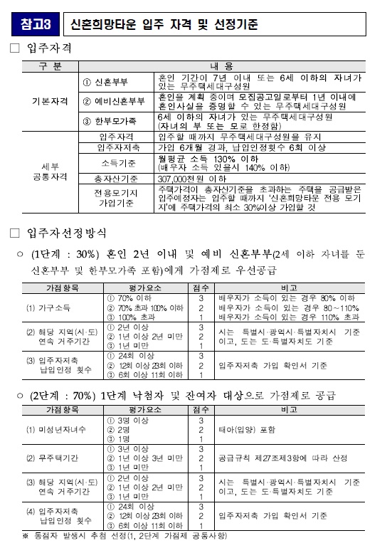 혼인 2년 이내 및 예비 신혼부부*에게 30%를 우선공급(1단계)하고, 2단계로 나머지 70%는 1단계 낙첨자 및 그외 대상에게 공급한다.
