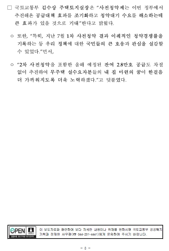 또한, “특히, 지난 7월 1차 사전청약 결과 이례적인 청약경쟁률을 기록하는 등 우리 정책에 대한 국민들의 큰 호응과 관심을 실감할 수 있었다.”면서, “2차 사전청약을 포함한 올해 예정된 잔여 2.8만호 공급도 차질 없이 추진하여 무주택 실수요자분들의 내 집 마련의 꿈이 한걸음 더 가까워지도록 더욱 노력하겠다.”고 덧붙였다.