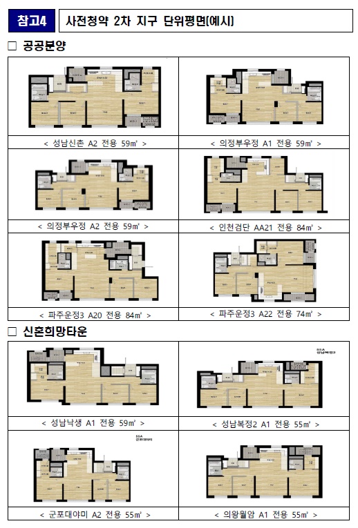 2차 사전청약은 2~3기 신도시ㆍ성남시 등 관심지역을 중심으로 진행되며, 특히 수요자 선호가 가장 높은 전용 84m² 물량을60~85m² 비중의 약 67% 수준까지 높여 공급한다.