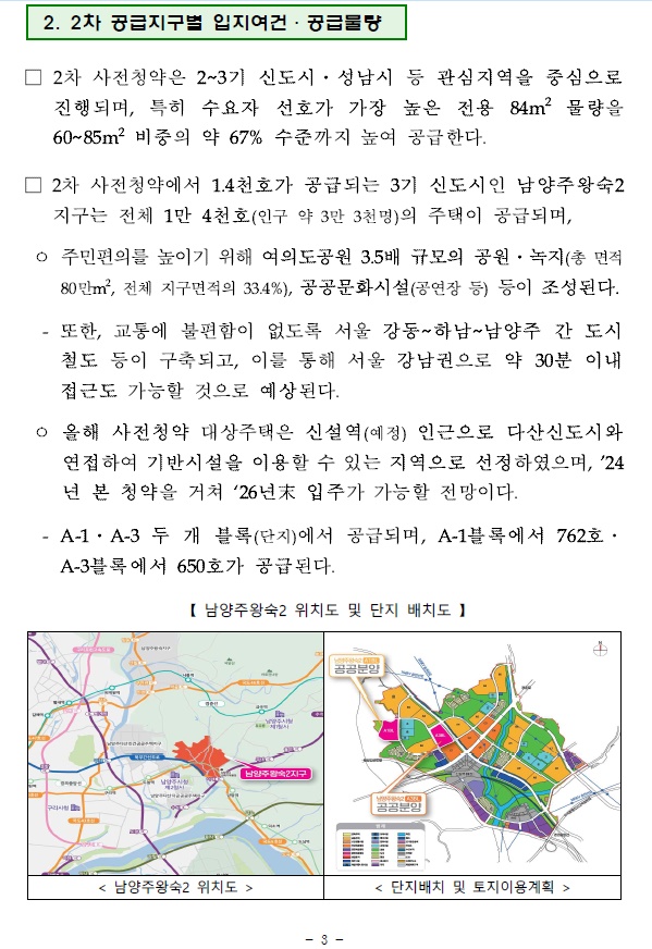 2차 사전청약에서 1.4천호가 공급되는 3기 신도시인 남양주왕숙2 지구는 전체 1만 4천호(인구 약 3만 3천명)의 주택이 공급되며, 주민편의를 높이기 위해 여의도공원 3.5배 규모의 공원ㆍ녹지(총 면적 80만m², 전체 지구면적의 33.4%), 공공문화시설(공연장 등) 등이 조성된다.
