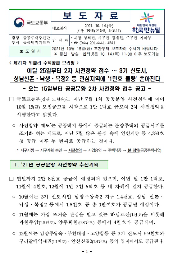 국토교통부(장관 노형욱)는 지난 7월 1차 공공분양 사전청약에 이어 10월 15(금) 모집공고를 시작으로 1만 1백호 규모의 2차 사전청약을 시행한다고 밝혔다.