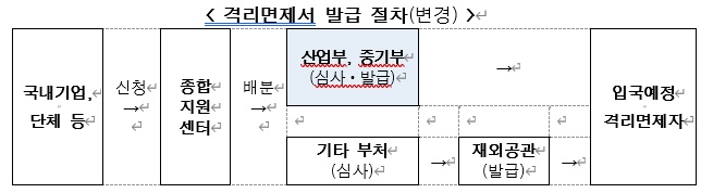 ※ 기대효과 : ① 처리기간 단축(신청에서 발급까지 약 14일 내외 → 최대 7일), ② 격리면제서 변경시 신속한 조치 가능(심사부처ㆍ해외공관 → 심사부처)