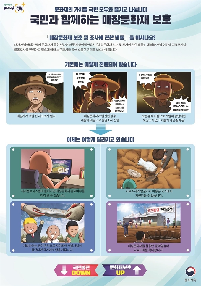 국민과 함께하는 매장문화재 보호 포스터. 문화재청 제공우리 문화유산을 발굴하는 데 드는 비용을 전부 국가가 지원하는 방안이 추진된다. 또 문화재가 어디에 매장돼 있고 어떤 조치가 필요
