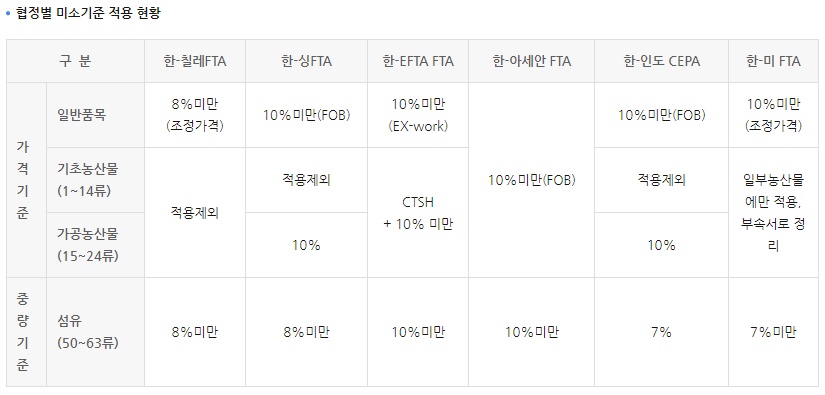 세번변경기준 적용에 있어 세변변경이 일어나지 않는 비원산지 재료 가격이 당해 물품 전체 가격에서 차지하는 부분이 미미할 경우, 세변이 변경되는 것으로 간주하는 기준으로 미소기준(De minimis 또는 tolerance rule이라고 함)