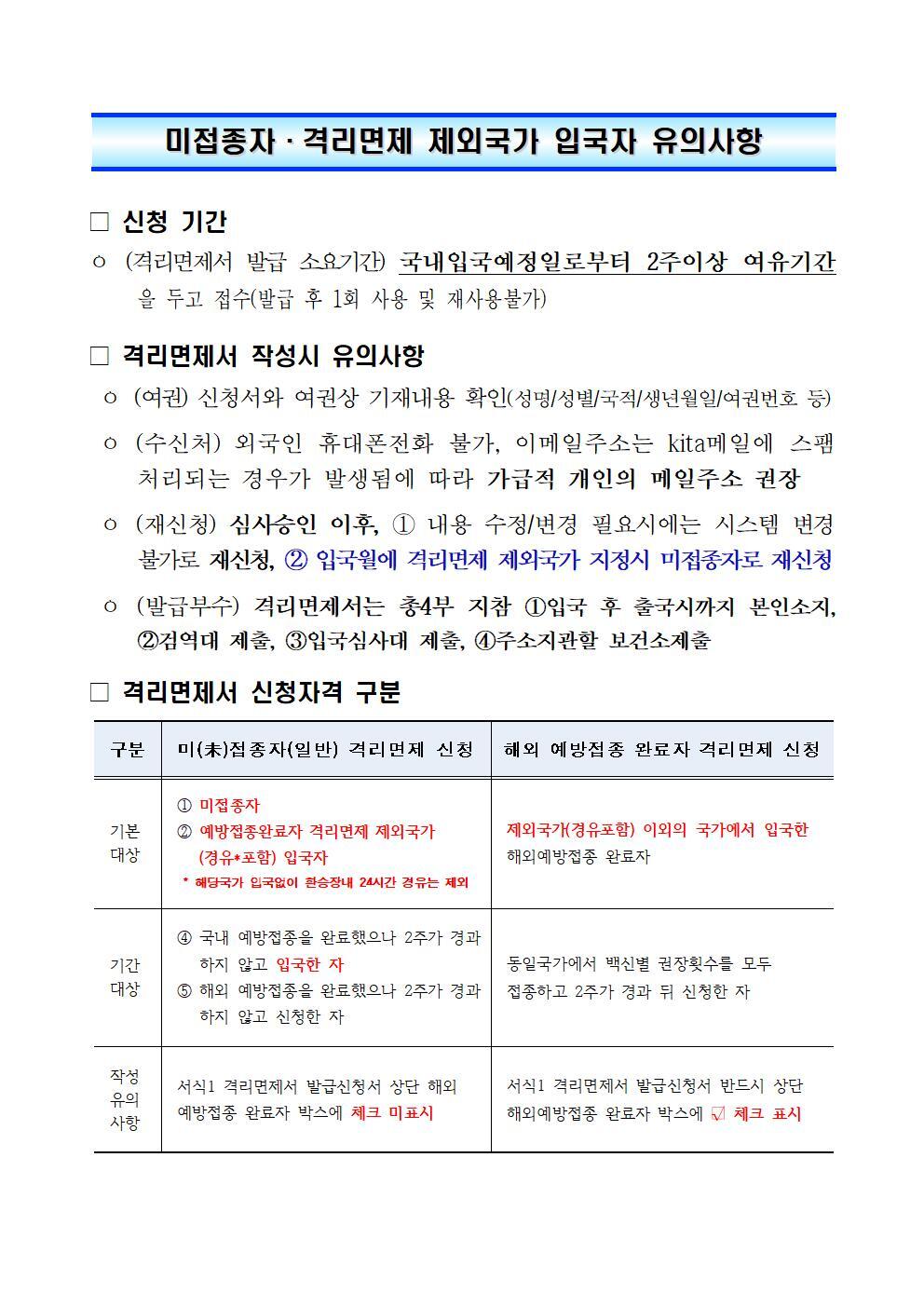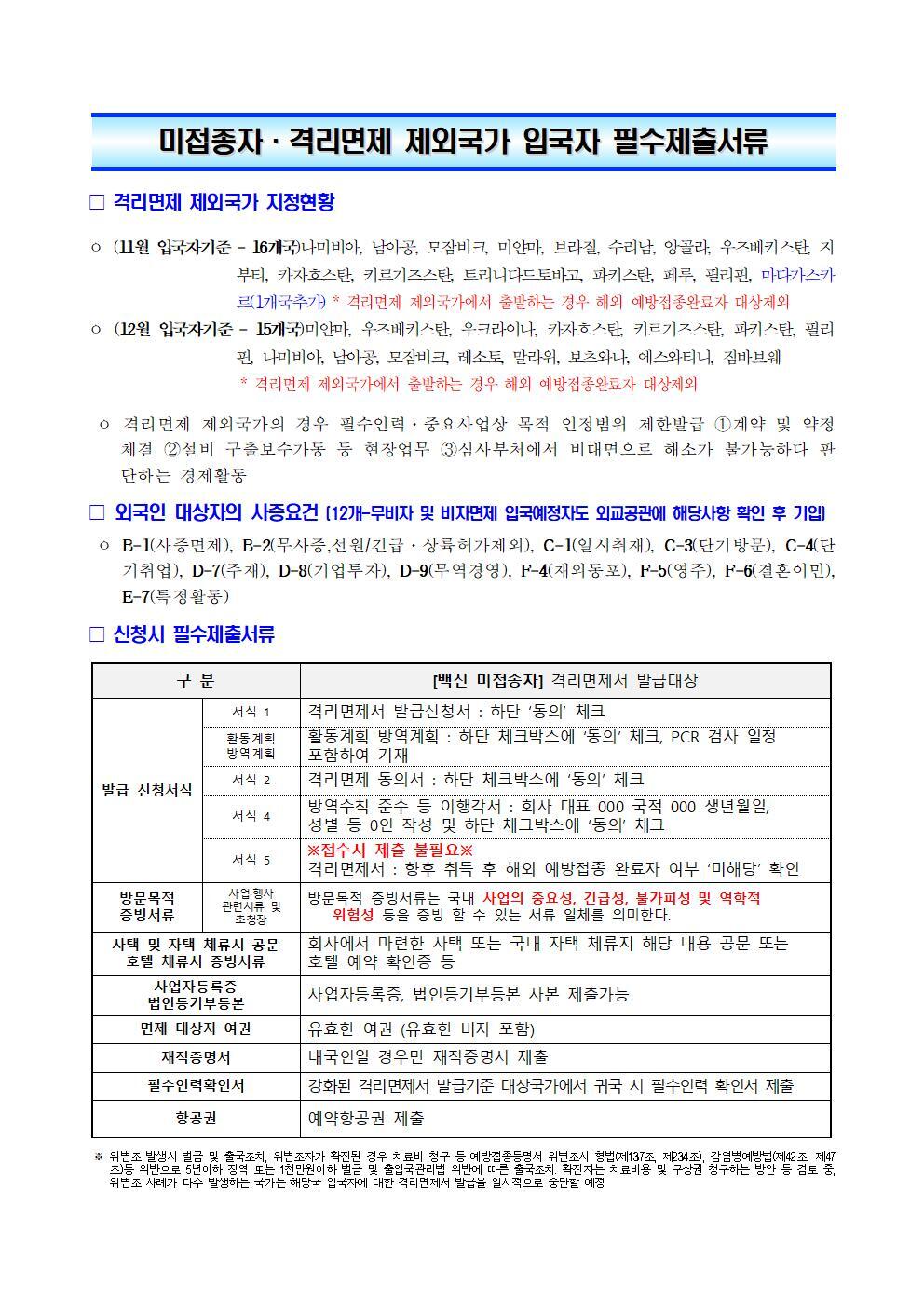 [미접종자 및 유행국가입국자]격리면제서 발급안내(중요사업상 목적)