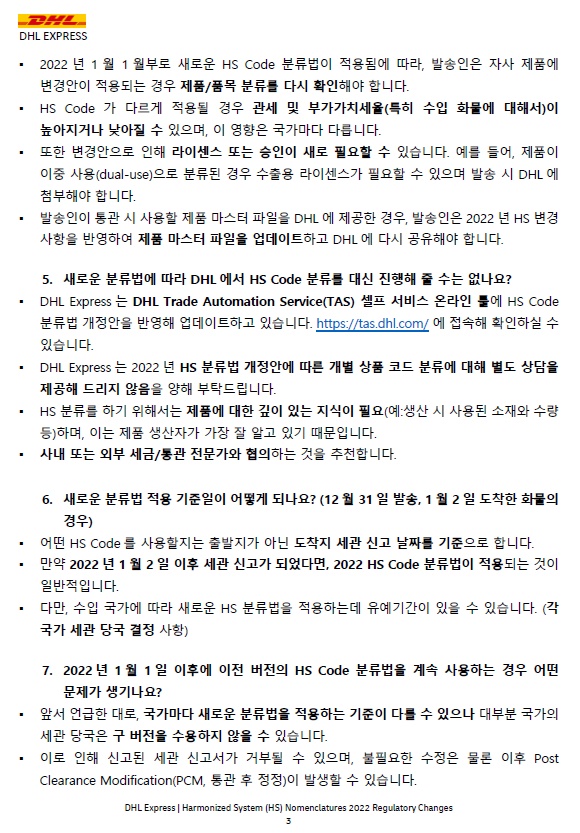 ü DHL Express는 현재 DHL Trade Automation Service(TAS) 셀프 서비스 온라인 툴을 2022년 1월 1일 현재 HS 명명 변경 사항을 반영하여 업데이트하고 있습니다. https://tas.dhl.com/ 링크를 통해 액세스할 수 있습니다.