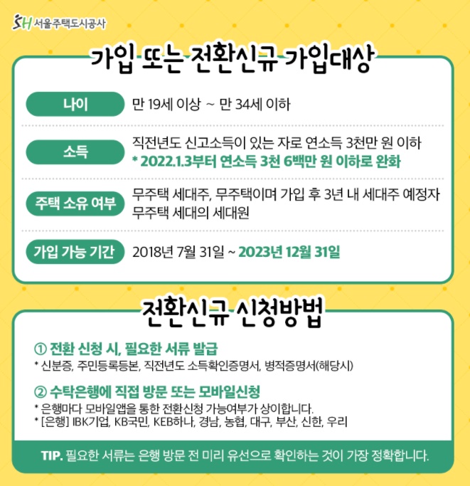 먼저 ① 나이조건은 기존의 만19세부터 만29세까지에서 만34세까지로 확대되었습니다. 군복무를 2년 하셨으면 만36세까지 가입할 수 있구요. ② 또한 기존에는 무주택 세대주만 가입하실 수 있었는데요, 무주택세대 세대원이나 3년 내 무주택세대주가 될 것으로 예정되는 무주택자도 가입할 수 있습니다. 지금은 유주택자인 부모님과 같이 사는 유주택 세대의 세대원이지만, 이직이나 결혼으로 3년 내에 전셋집으로 이사갈 계획에 있으신 분들도 가입하실 수 있습니다. ③ 마지막 조건은 3천만원 이하 신고소득이 있으셔야 합니다.