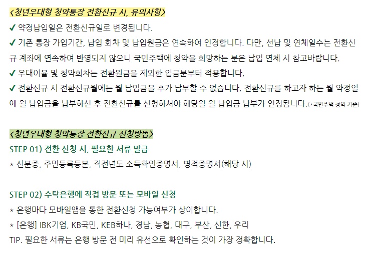 주택청약종합저축에 가입하셨던 분들도 기존 가입기간을 인정받으며 청년우대형 청약통장으로 전환이 가능합니다.