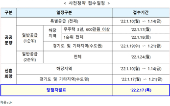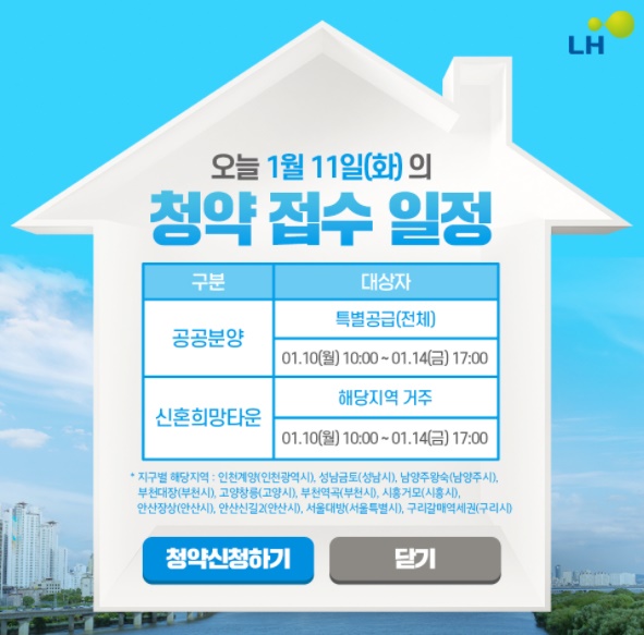 1) 일정은 1/10~14일 공공분양 특별공급, 1/17~18일 일반공급 1순위 해당 지역 거주자, 1/19~21일 경기도 및 수도권 거주자 접수입니다. 신혼희망타운은 1/10~14일 해당 지역 거주자, 이후 1/17~21일까지 수도권 거주자 접수입니다. 당첨자 발표는 다음 달 2/17일입니다.