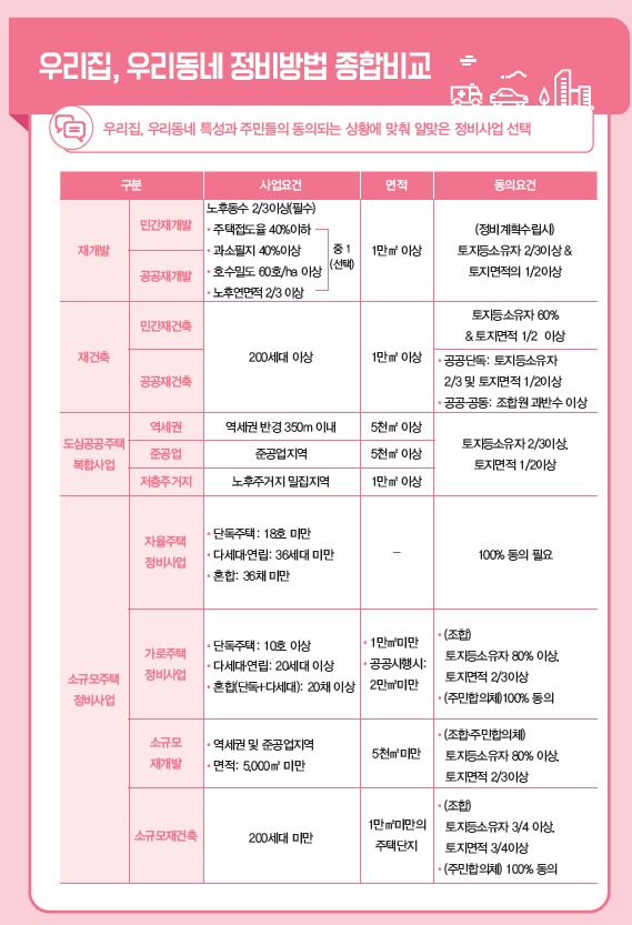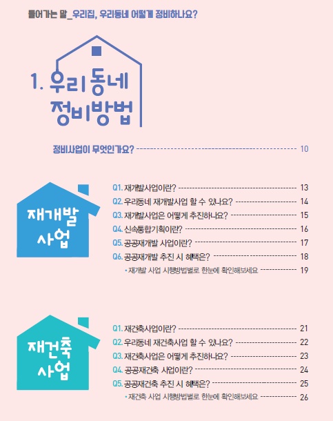 안내서에서는 재개발, 재건축, 도심공공주택복합사업, 소규모주택정비사업 등 서울시에서 할 수 있는 각종 정비사업의 종류와 방법 등을 소개하고 있다. 공공이 민간의 정비사업을 지원하는 '신속통합기획'에 관한 내용도 담았다.