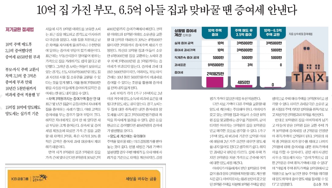 부모·자식 주택 교환시 차액 3.5억 중 3억은 증여세 부과 안돼