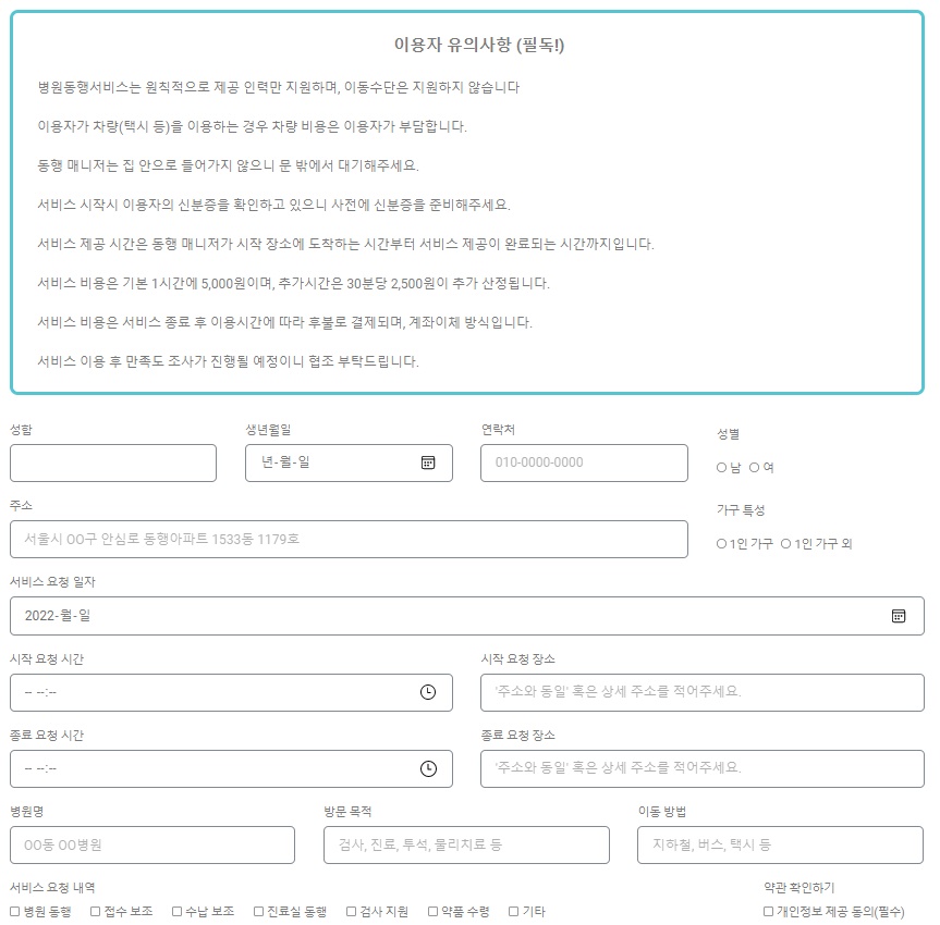 서울 시민 중 현재 1인 가구 이시거나 「1인 가구 유사 상황*」에 처했을때 병원 이용에 도움이 필요한 경우 동행 도우미를 지원하는 제도입니다.