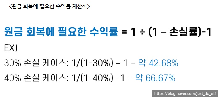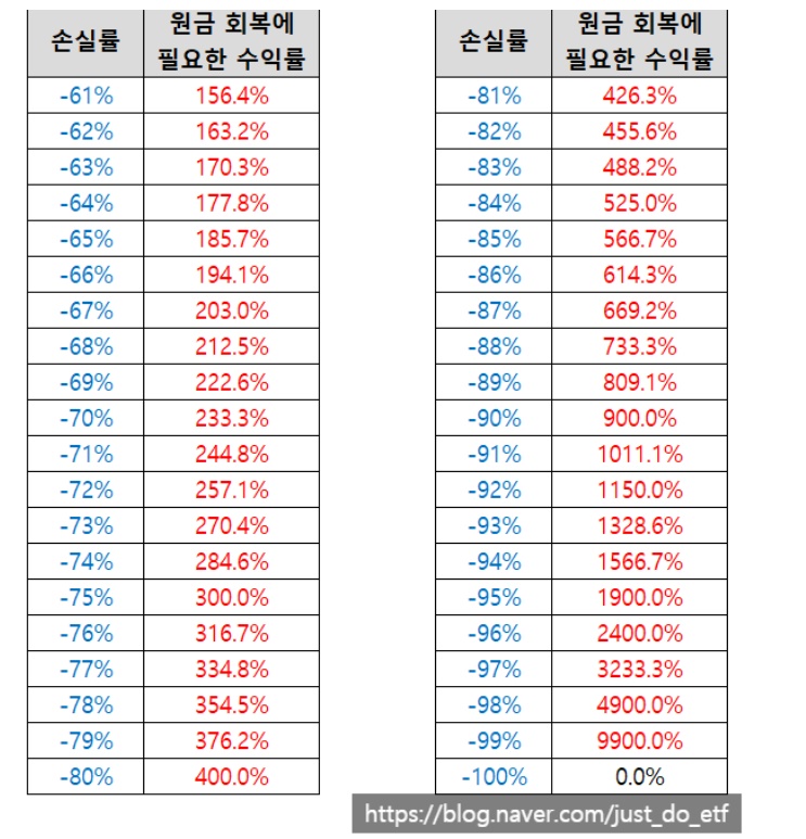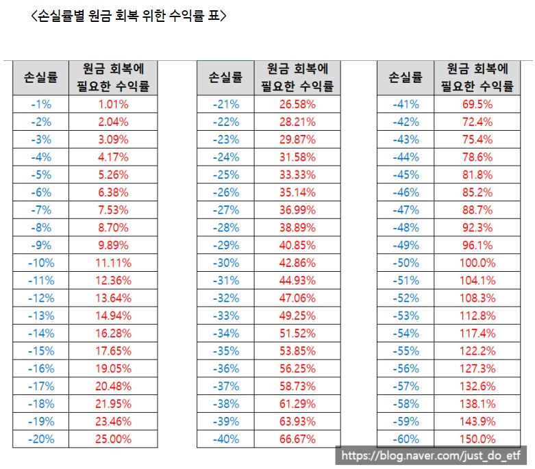 안녕하세요 ETF매니아 입니다. 이번 포스팅에서는 손실률 별로 원금 회복에 필요한 수익률이 어떻게 되...