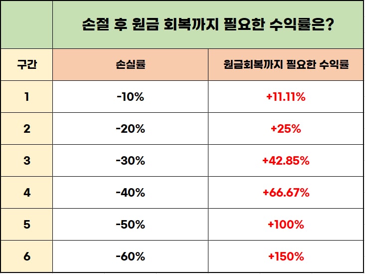 손실률 대비 원금회복까지 필요한 수익률 표를 제시해드립니다.