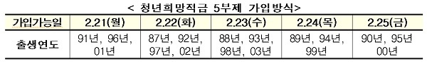 (1991·96년생과 2001년생은 21일 가입가능, 1987·92·97년생과 2002년생은 22일 가입가능. 1988·93·98년과 2003년생은 23일, 1989·94·99년생은 24일, 1990·95년생과 2000년생은 25일 가입가능.)