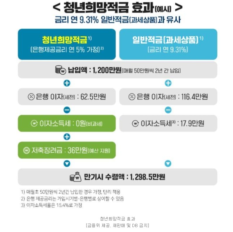 예시) 은행제공금리를 연 5%로 가정하고 청년희망적금에 가입해 매월 50만원씩 2년간 총 1200만원을 납입했을 경우, 은행이자(세전)는 62만5000원이다. 여기에 저축장려금 36만원을 받고 이자소득세를 내지 않기 때문에 만기시 총 1298만 5000원을 받을 수 있다.