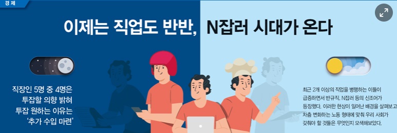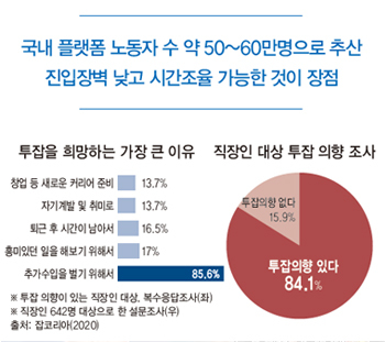 재택근무가 늘면서 부업에 뛰어드는 직장인이 많아지고 있다. 하나의 직업에만 얽매이지 않는 일명 ‘N잡러’라고 볼 수 있다. 잡코리아 조사 결과 실제로 직장인 3명 중 1명은 부업을 하고 있다고 한다. 남자의 경우는 배달·배송 부업이 많았고, 여자는 블로그와 SNS 운영 같은 판매 유형이 많았다.
