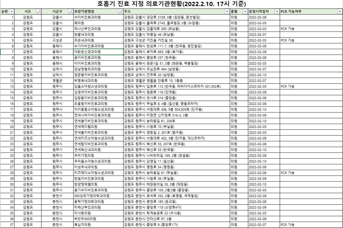 호흡기 진료 지정 의료기관 현황 (2022.2.10. 17시 기준)