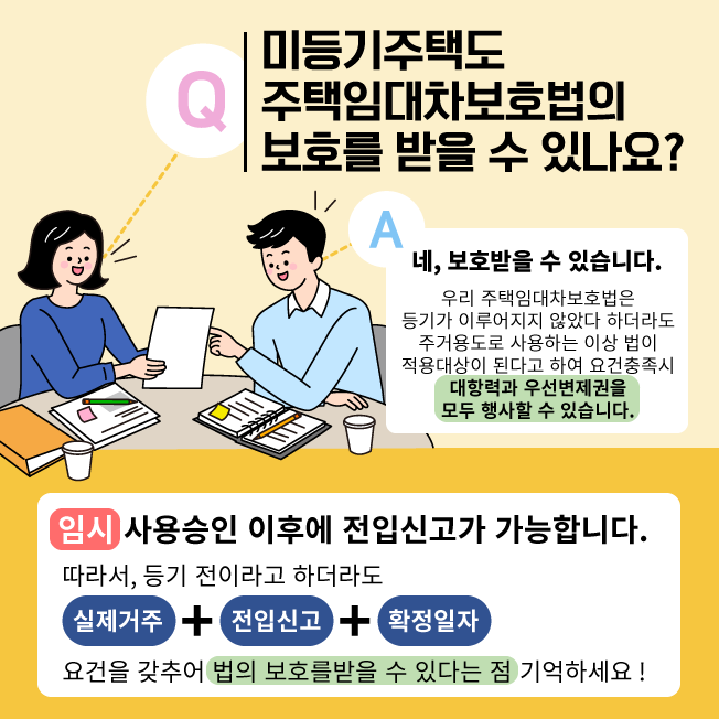 ⑥신고도 바로 가능: 미등기 아파트라도 전입신고와 확정일자를 받을 수 있다. 그래야 주택 소유자가 바뀌더라도 새로운 소유자에게 임대차 계약이 존속함을 주장할 수 있고 계약 종료 후 보증금을 반환받을 수 있는 권리가 생긴다. 집이 경매에 넘어갈 때 우선적으로 내 전세보증금을 보장받을 수도 있다.
