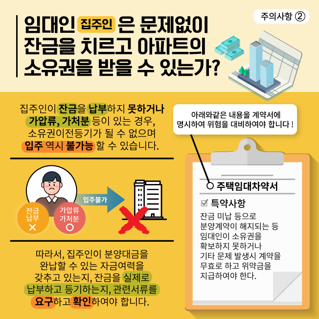 ③가압류는 없나: 전세보증금을 돌려받을 때 문제가 없도록 분양계약서에 가압류·가처분이 걸린 게 없는지 시행사나 시공사에 알아봐야 한다. 신축 분양 아파트의 경우 임대인이 분양 잔금을 완납하지 못하거나 임대인 채무관계로 아파트 분양권에 가압류·가처분이 걸릴 수 있다.