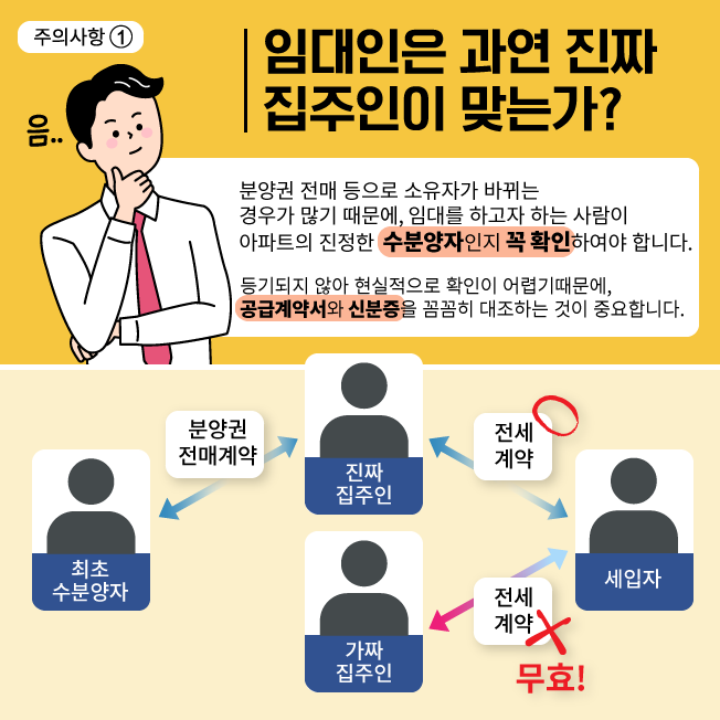 ②동일인 확인: 전세 계약 전에 아파트공급계약서나 분양계약서상 인물과 현재 집주인이 같은 사람인지 신분증을 놓고 대조해야 한다. 통상 분양권은 자유롭게 매매할 수 있어 소유자가 바뀌는 경우가 많으니 반드시 전세 계약 직전 소유자 명의를 확인해야 한다.