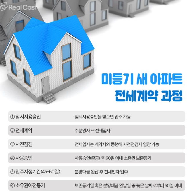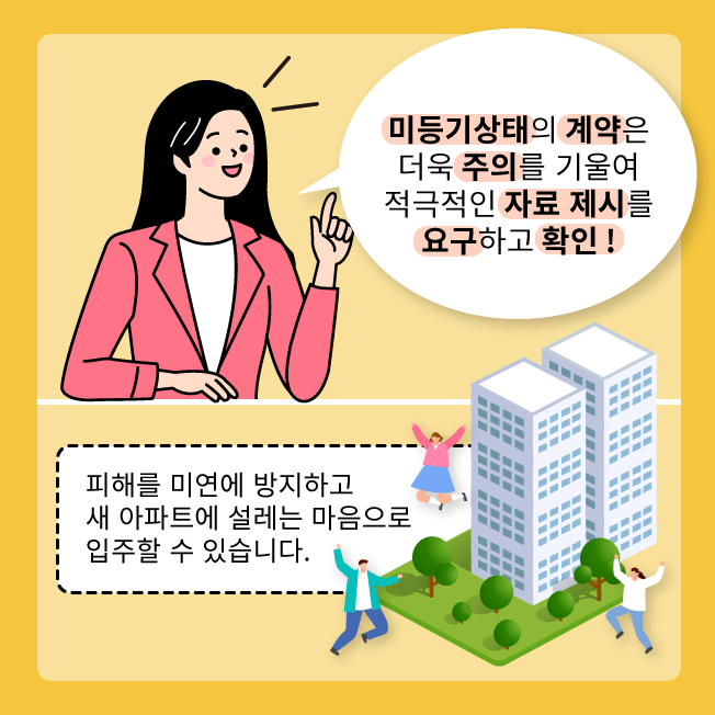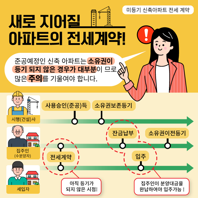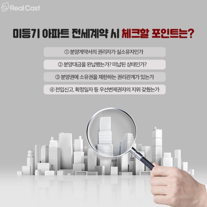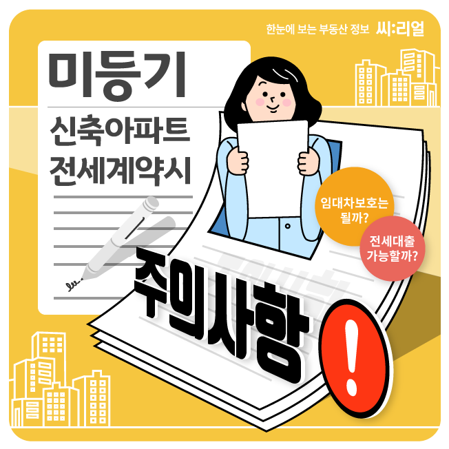 신축 아파트로 입주할 때 ‘소유권 이전 등기’가 안 된 상태에서 임대차계약이 진행되는 경우가 많다. 자금이 부족한 새 아파트 소유자들이 세입자들로부터 전세보증금을 받아 분양 잔금을 치르고 등기를 하기 때문이다. 정씨 같은 사례를 막고자 ‘미등기 아파트에 전세 계약을 맺을 시 주의해야 할 6가지 사항’을 소개한다.