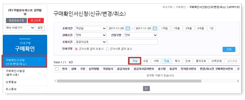 (1) 구매확인서 신청(신규/변경/취소) -> [작성] 클릭