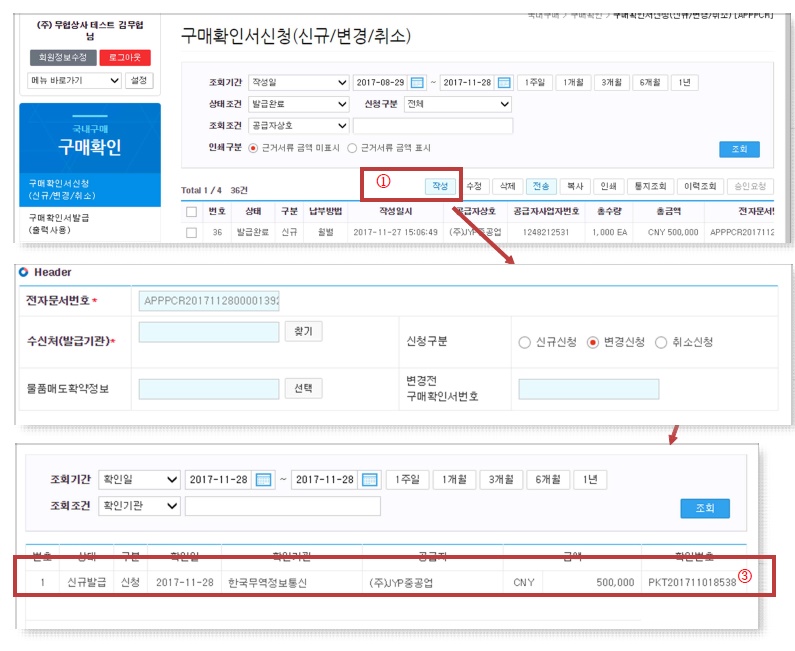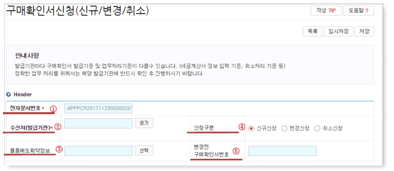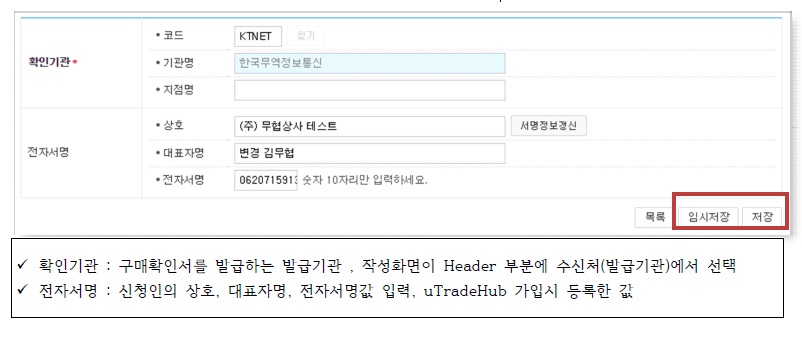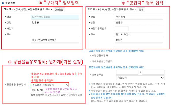 - 수발신인식별자 : 구매확인서 발급시 공급자에게도 전자문서로 자동전달하기 위해 필요한 정보