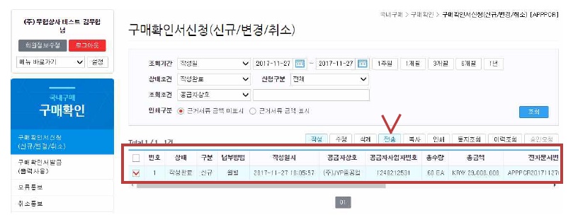 - ‘작성완료’ 상태인 문서를 체크하고 ‘전송’ 버튼 클릭하면 발급기관으로 발급신청 완료