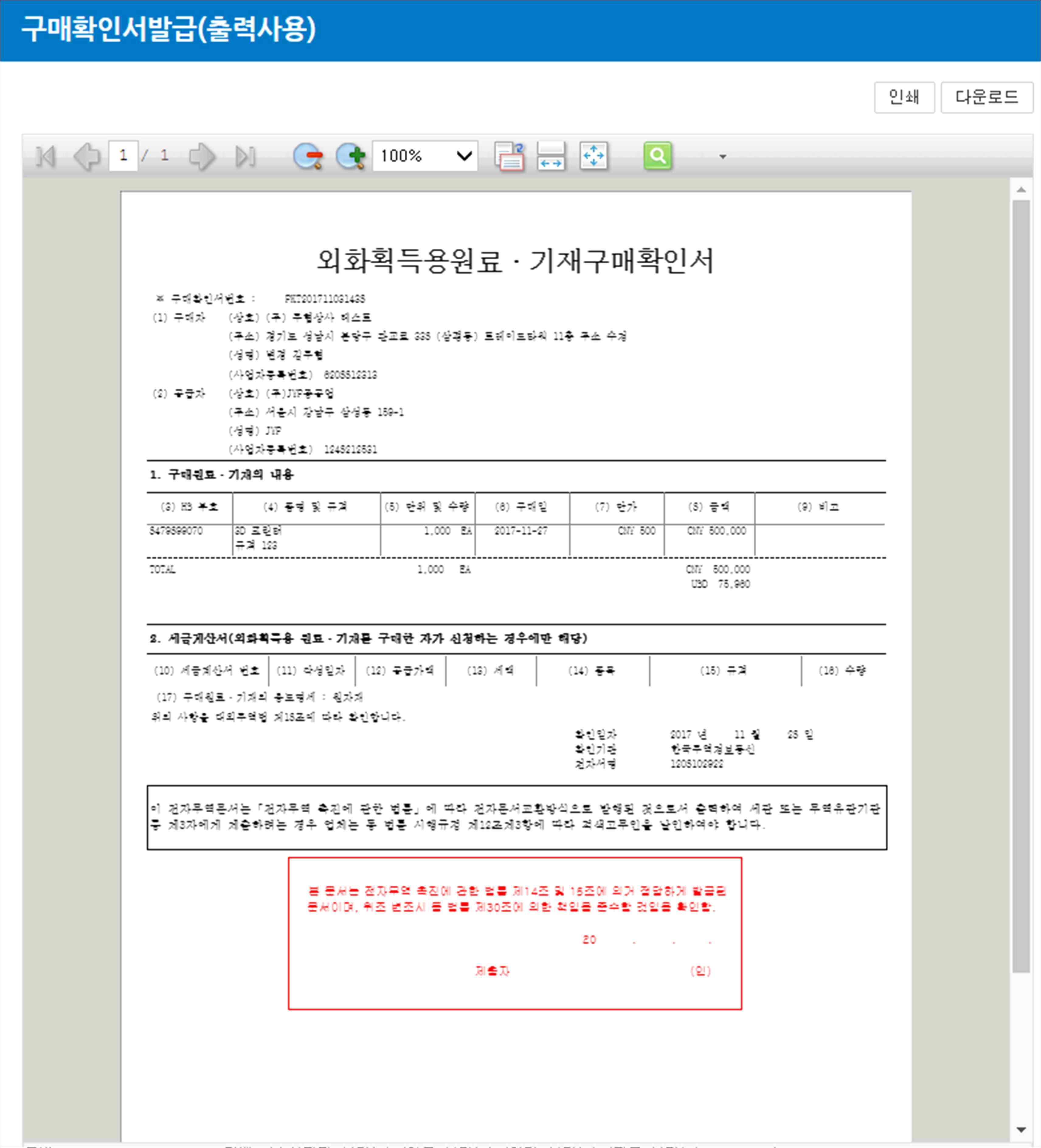 ※ 구매원료 물품등의 내용 중 ‘단가’에 금액과 통화코드 확인1.2. 구매확인서 발급 확인사항
