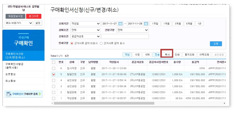 ※ 복사 후 전송 전에 반드시 구매자, 공급자 정보, 신청구분이 신규인지 변경인지 확인 필요