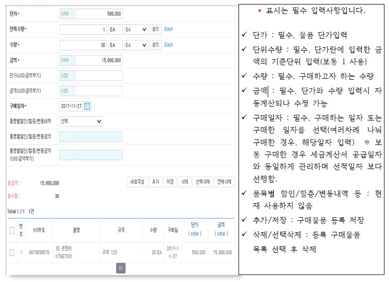 - 통화코드가 KRW나 USD가 아닐 경우 필수 입력(구매일자기준 ‘최초매매기준율’ USD 금액부기)