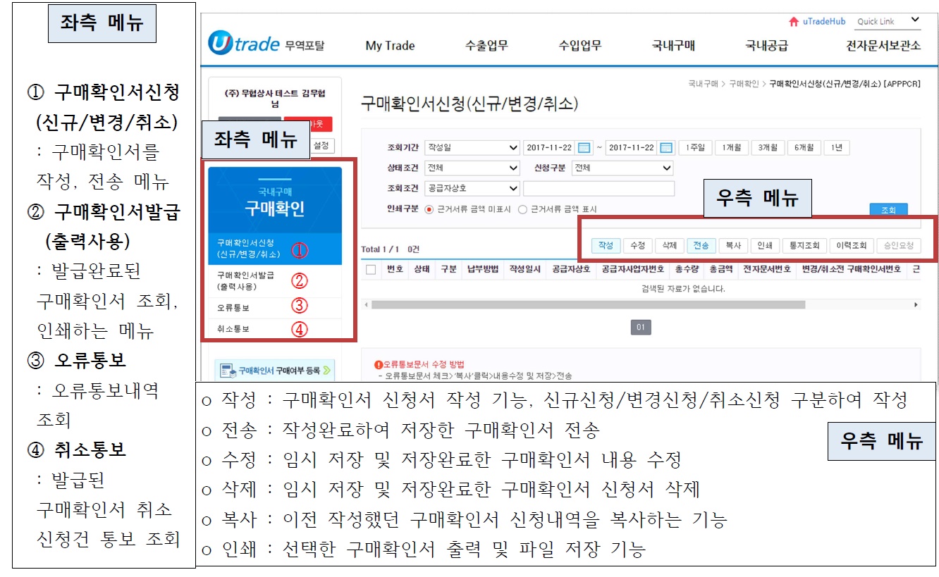 - 취소 : 발급된 구매확인서를 취소 신청, 이는 발급완료된 구매확인서 전체가 삭제되는 기능