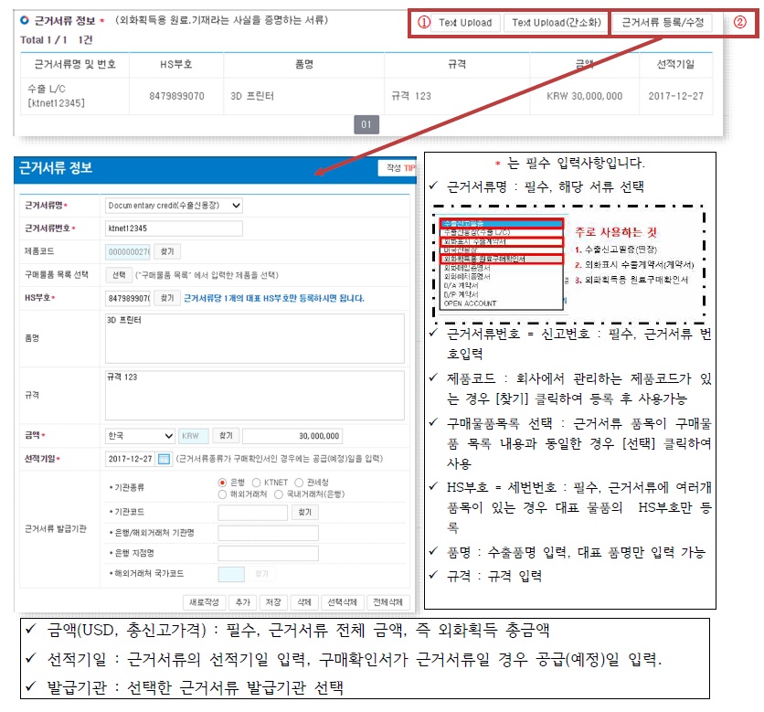 ② [Text Upload] / [Text Upload(간소화)] : 상단의 ‘구매물품 목록’ 등록시 기재요령과 동일
