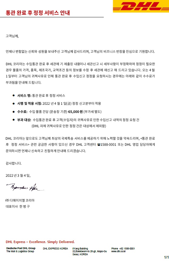 2022년 4월부터 통관 완료 후 정정 요청되는 건들에 대해서는 아래와 같이 통관 완료 후 정정 서비스 요금이 부과될 예정이니 업무에 참고 부탁드리며
