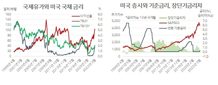 장기금리와 단기금리의 차이를 의미합니다. 그리고 여기서 보통 장기금리는 10년물 금리를, 단기금리는 2년물 금리를 사용합니다. 일반적으로는 장기금리가 단기금리보다 높은데 이 둘 간의 차이가 장단기 금리차에 해당하며, 장단기 금리차가 줄어들거나 역전한다는 것은 두 금리 사이의 차이가 점점 줄어든다는 것과 동일하죠.