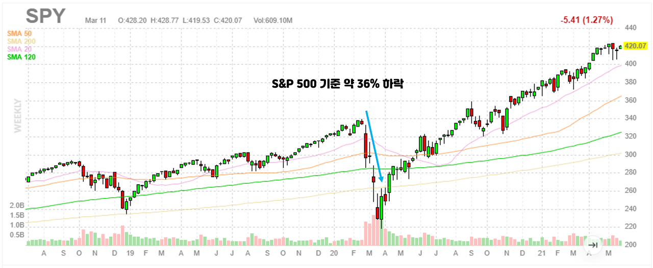 마지막으로 있었던 장단기 금리차의 역전은 2019년 중순이었습니다. 정확히 8월 말에 장단기 금리차가 -0.04%까지 갔다가 금방 회복하였죠. 이 정도는 사실 장단기 금리차의 역전이라고 보기도 애매하긴 한데, 이로부터 6개월 후에 코로나19로 인한 대 폭락장이 벌어졌습니다.