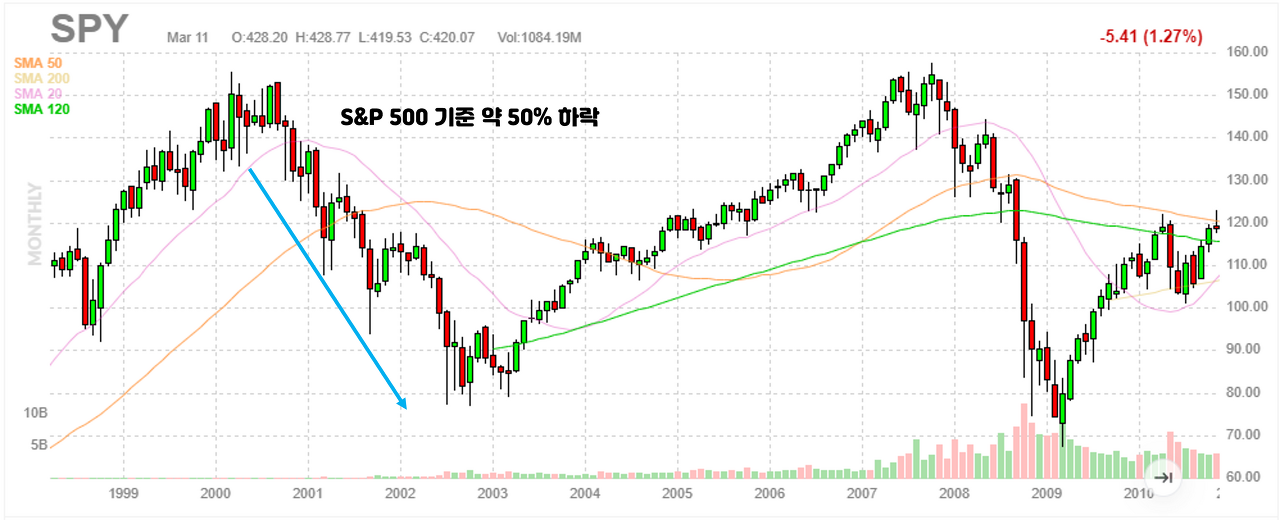 그런데 참 신기하게도 위의 세 시기 이후에 증시가 대폭락하는 일이 항상 발생했습니다. 우선 2000년 말부터 2001년 사이에 닷컴 버블이 터지며 나스닥을 필두로 미국의 모든 증시가 엄청나게 폭락하는 사태가 벌어졌습니다. 이 폭락장은 무려 2002년 말까지 이어졌으며, 딱 장단기 금리차가 역전되기 시작하고 1년 후에 증시가 폭락하기 시작하였습니다
