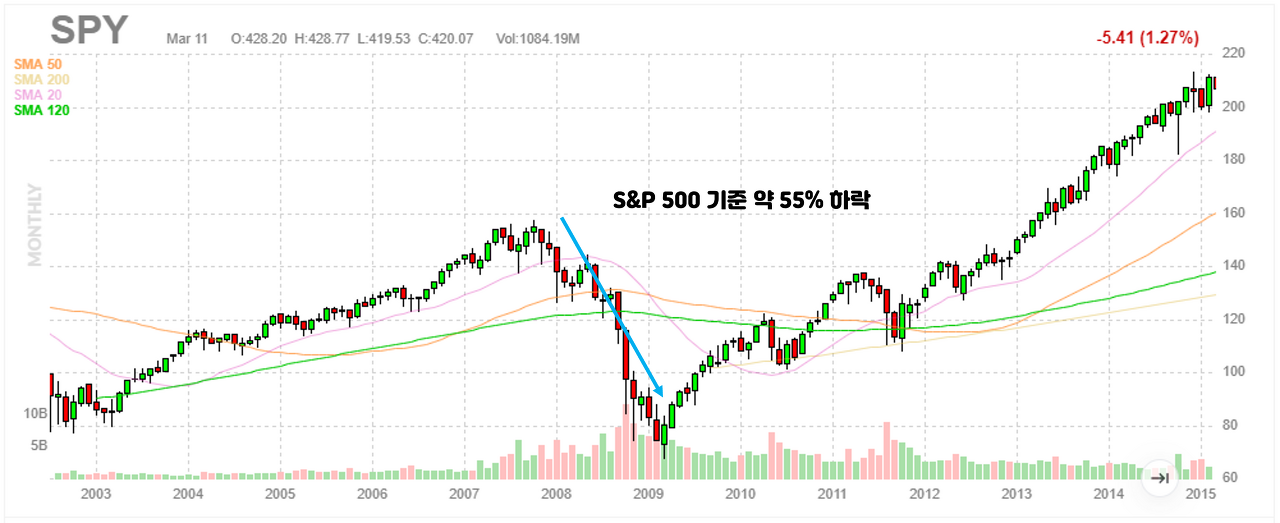 그렇다면 2006년~2007년 이후에는? 이때는 2008년부터 2009년까지 세계 금융위기로 인하여 진행된 폭락장이 뒤따랐습니다. 장단기 금리차 역전이 꽤나 오래 지속된 2007년 이후 1년 반~2년이 지나고부터 전 세계의 증시가 무지막지하게 폭락한 것입니다. 장단기 금리차의 역전이 지속되며 그동안 썩어 있던 금융 시스템의 부실이 한 번에 터지게 된 결과였죠.